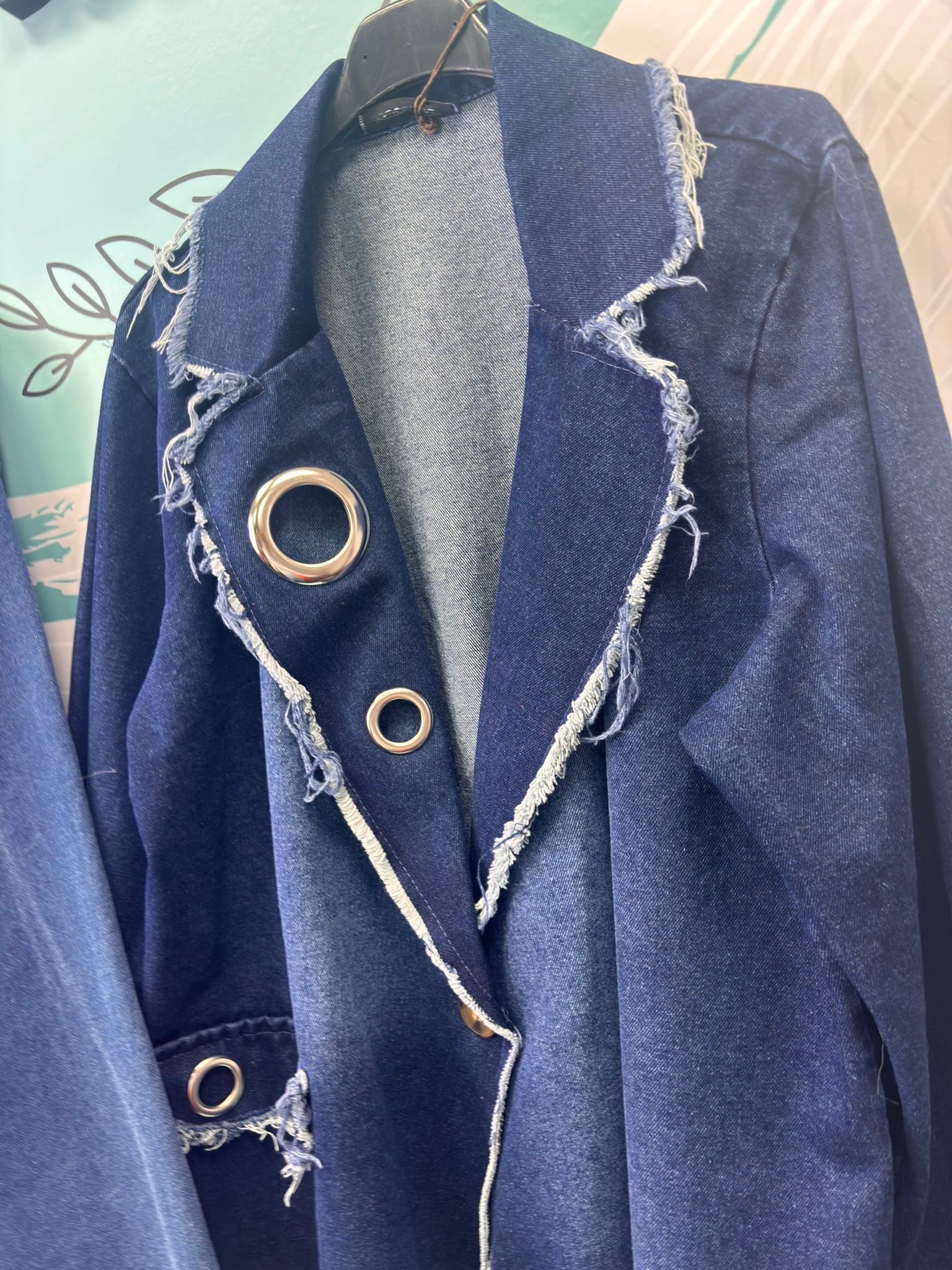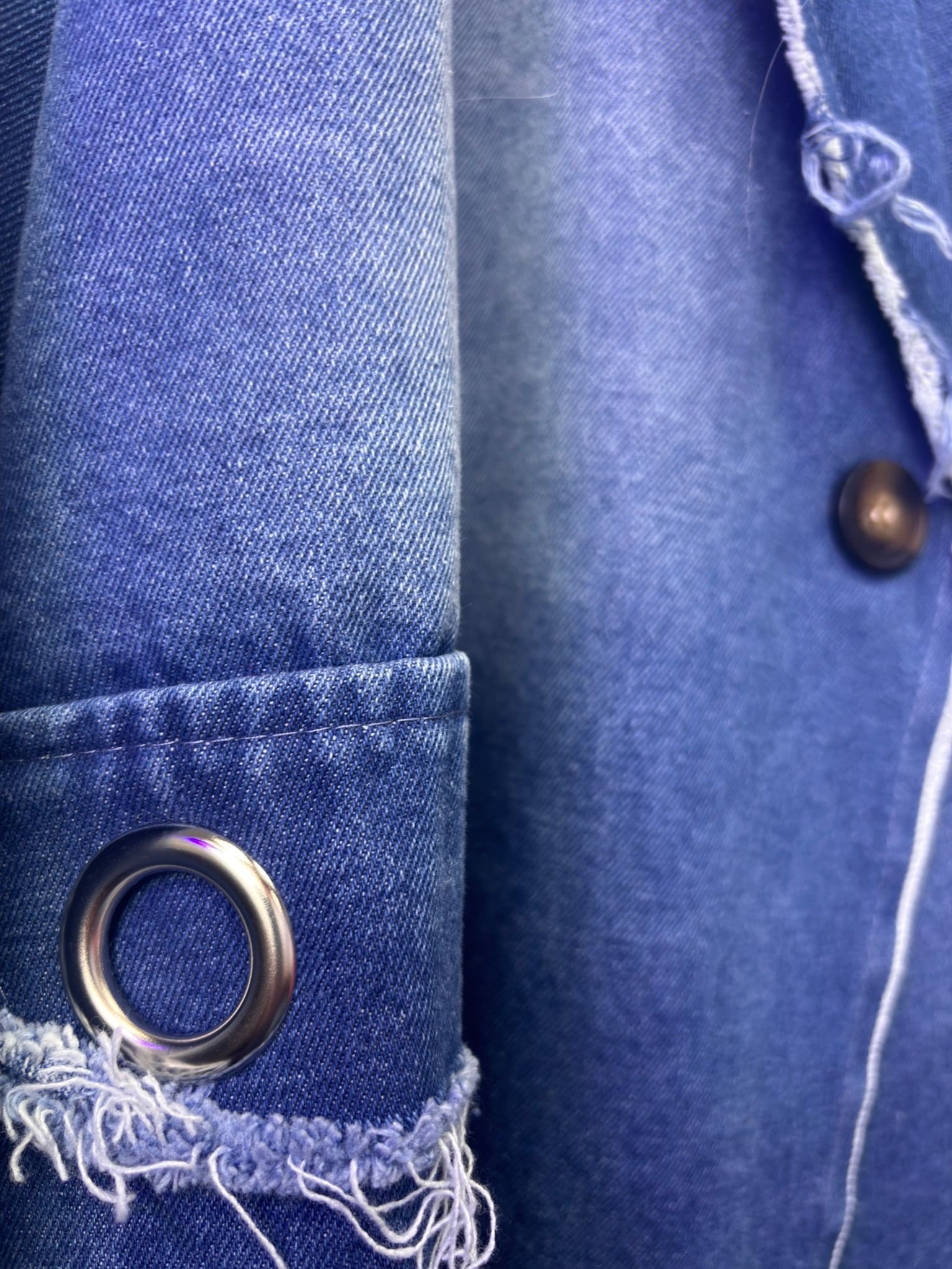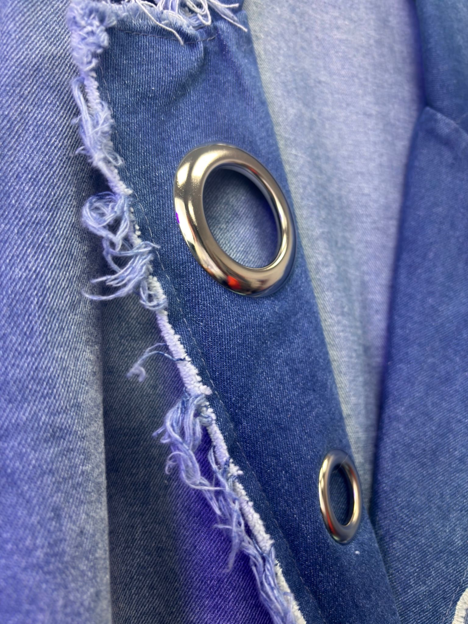 Una prenda moderna y audaz que combina elegancia y estilo urbano. Su corte oversize aporta comodidad y presencia, mientras que el detalle de arandelas y el diseño asimétrico le dan un toque único y sofisticado.