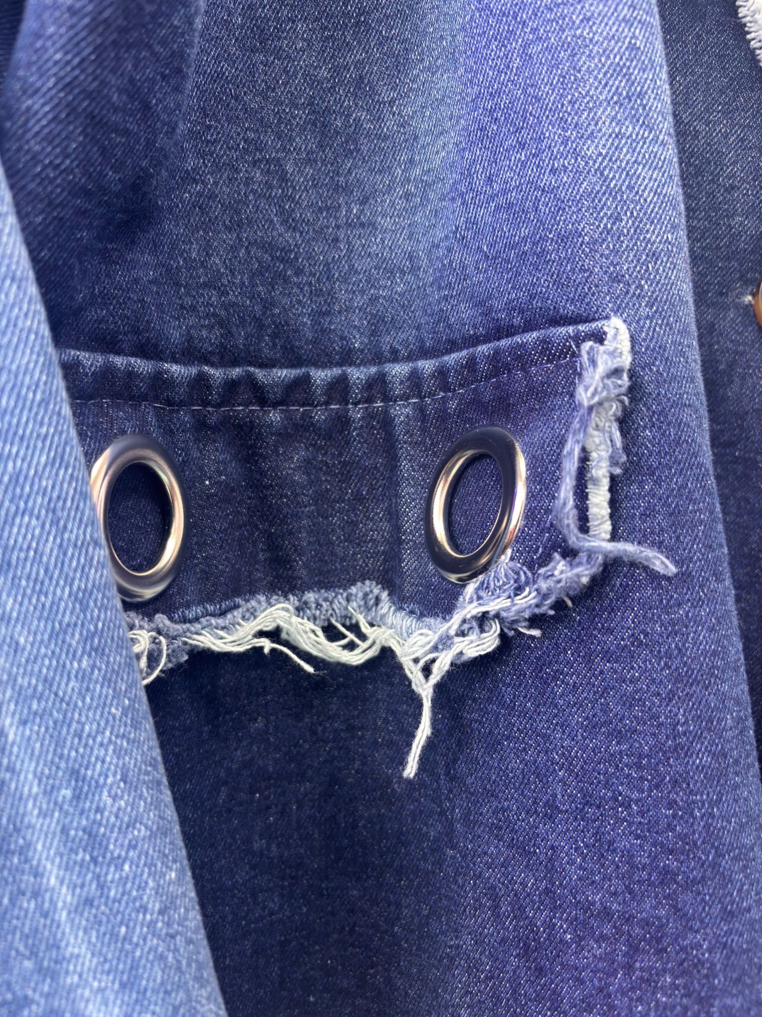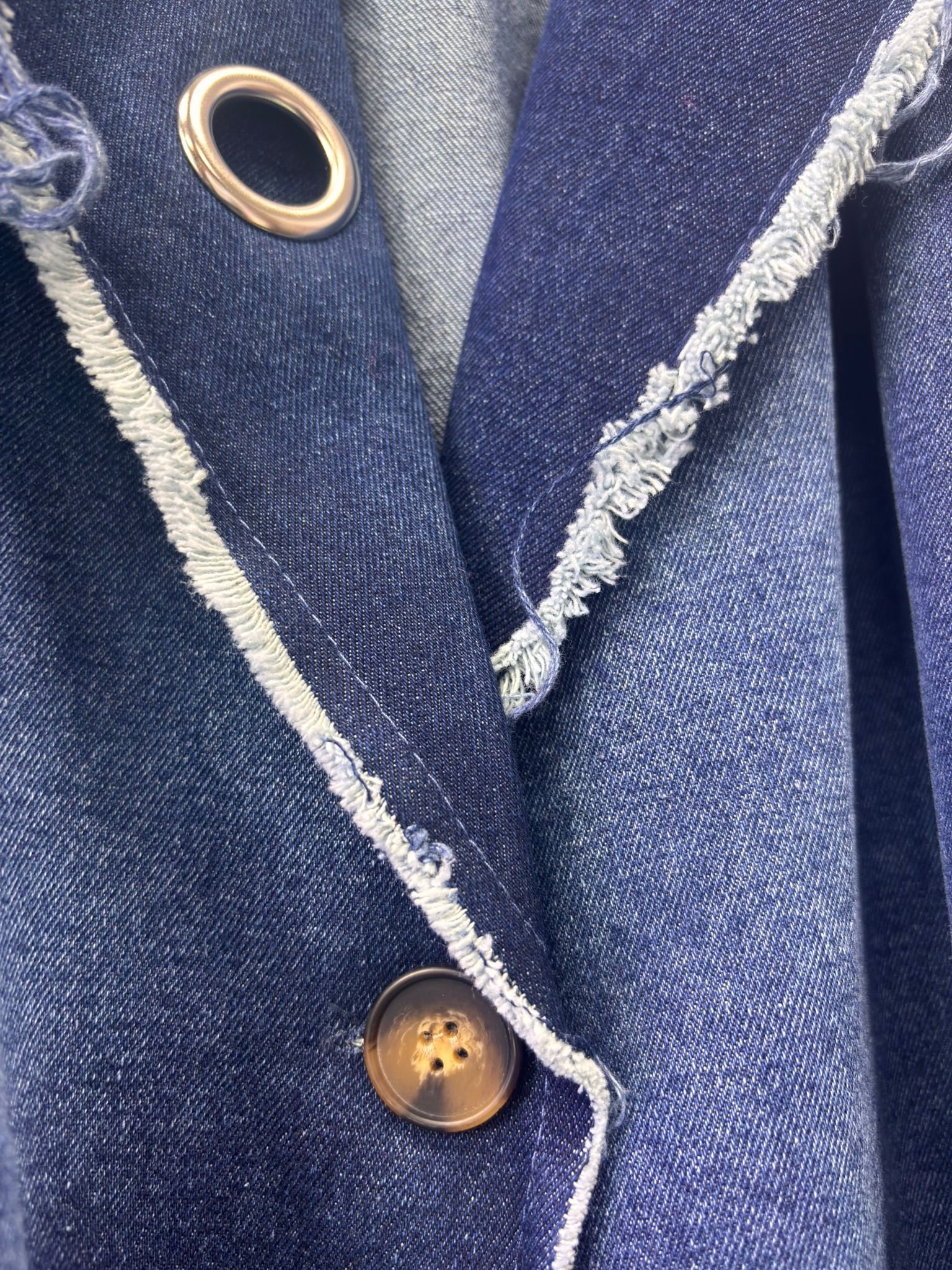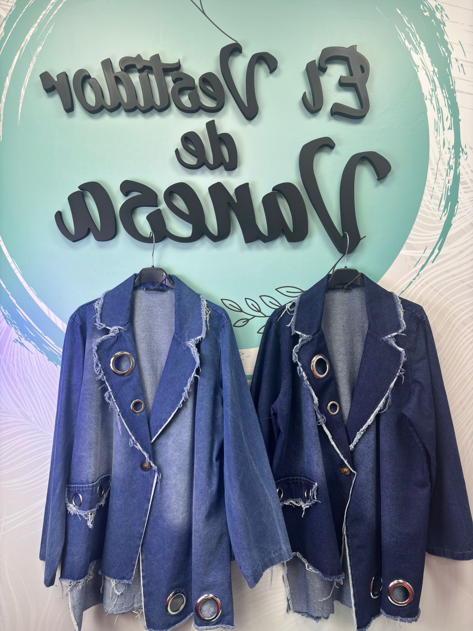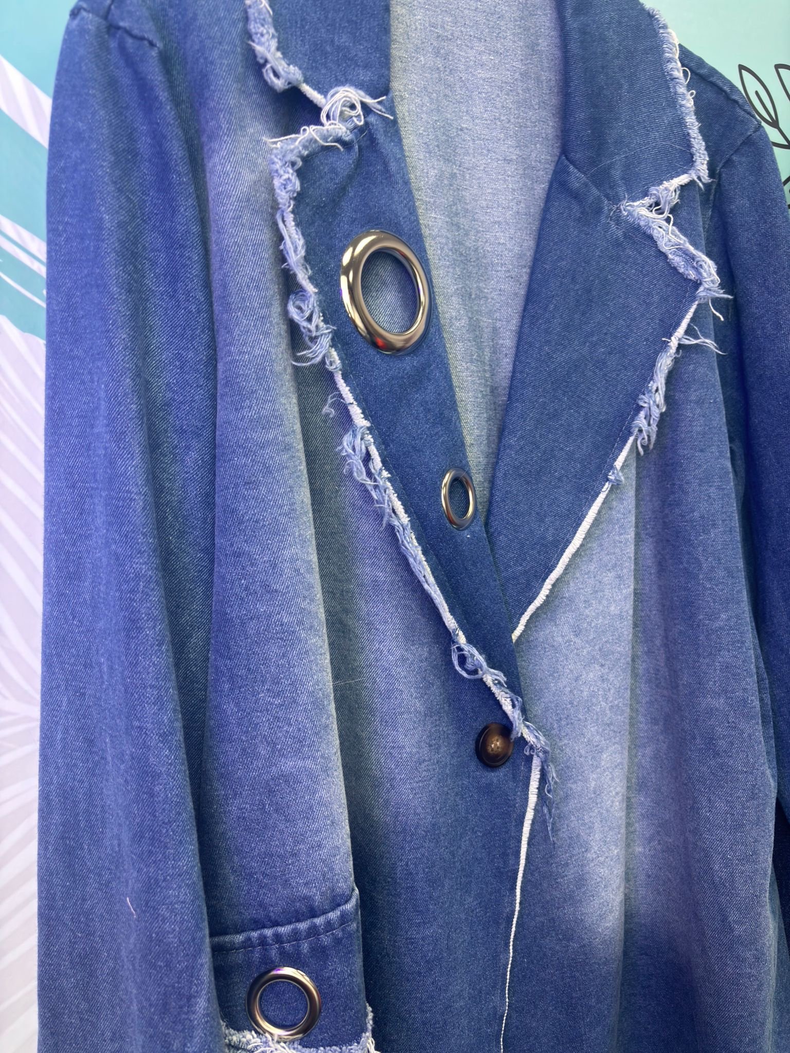 Una prenda moderna y audaz que combina elegancia y estilo urbano. Su corte oversize aporta comodidad y presencia, mientras que el detalle de arandelas y el diseño asimétrico le dan un toque único y sofisticado.