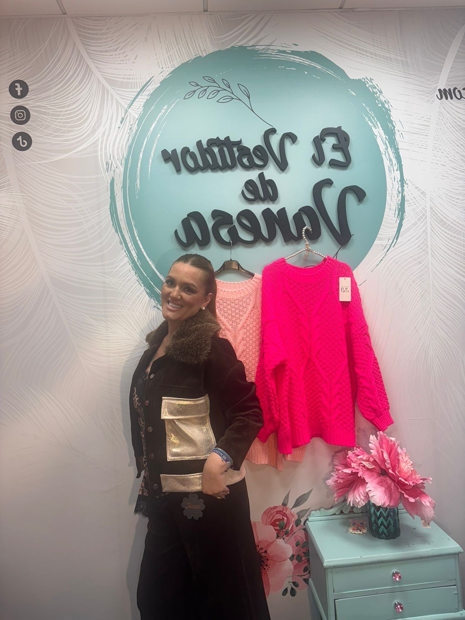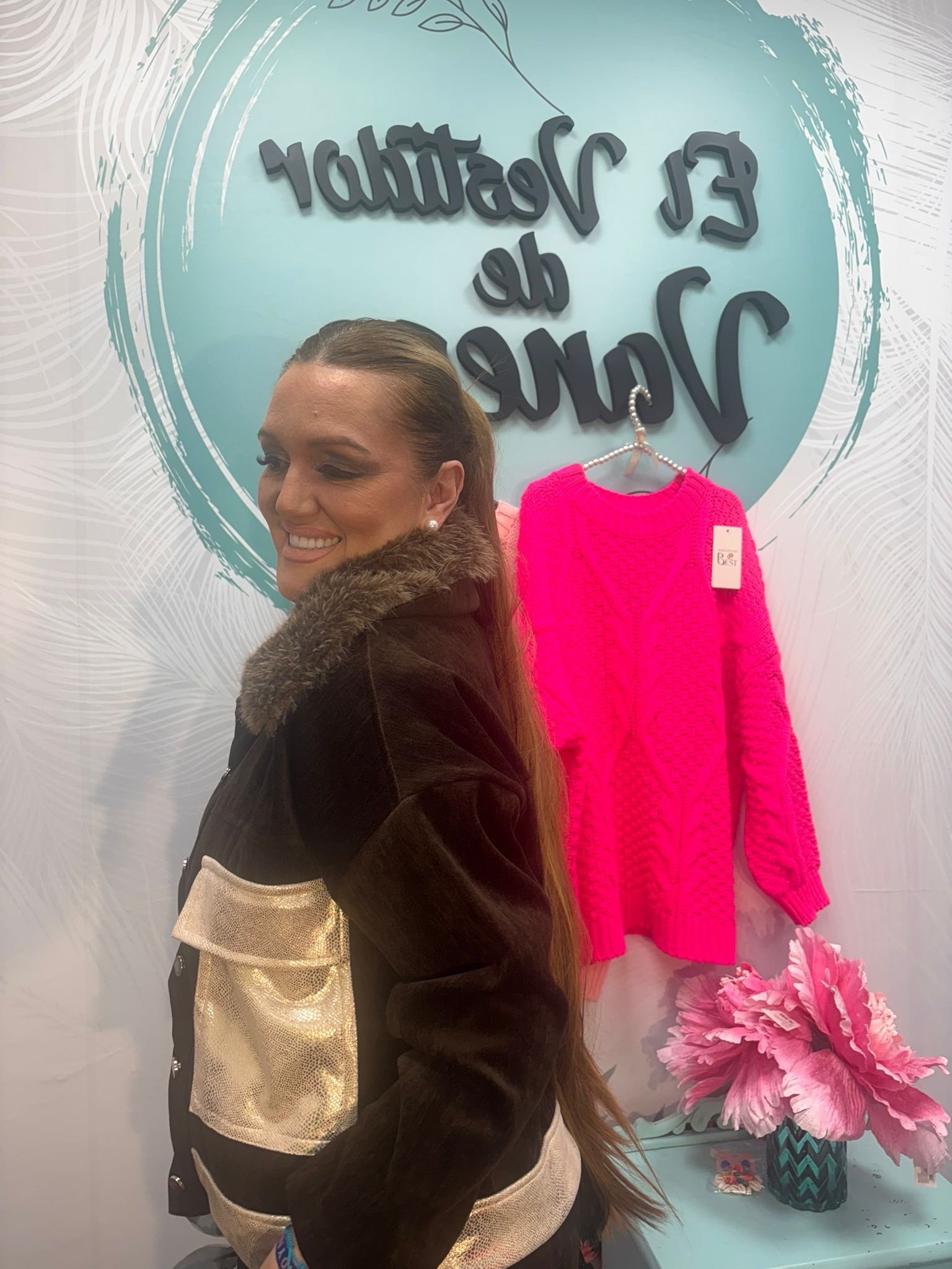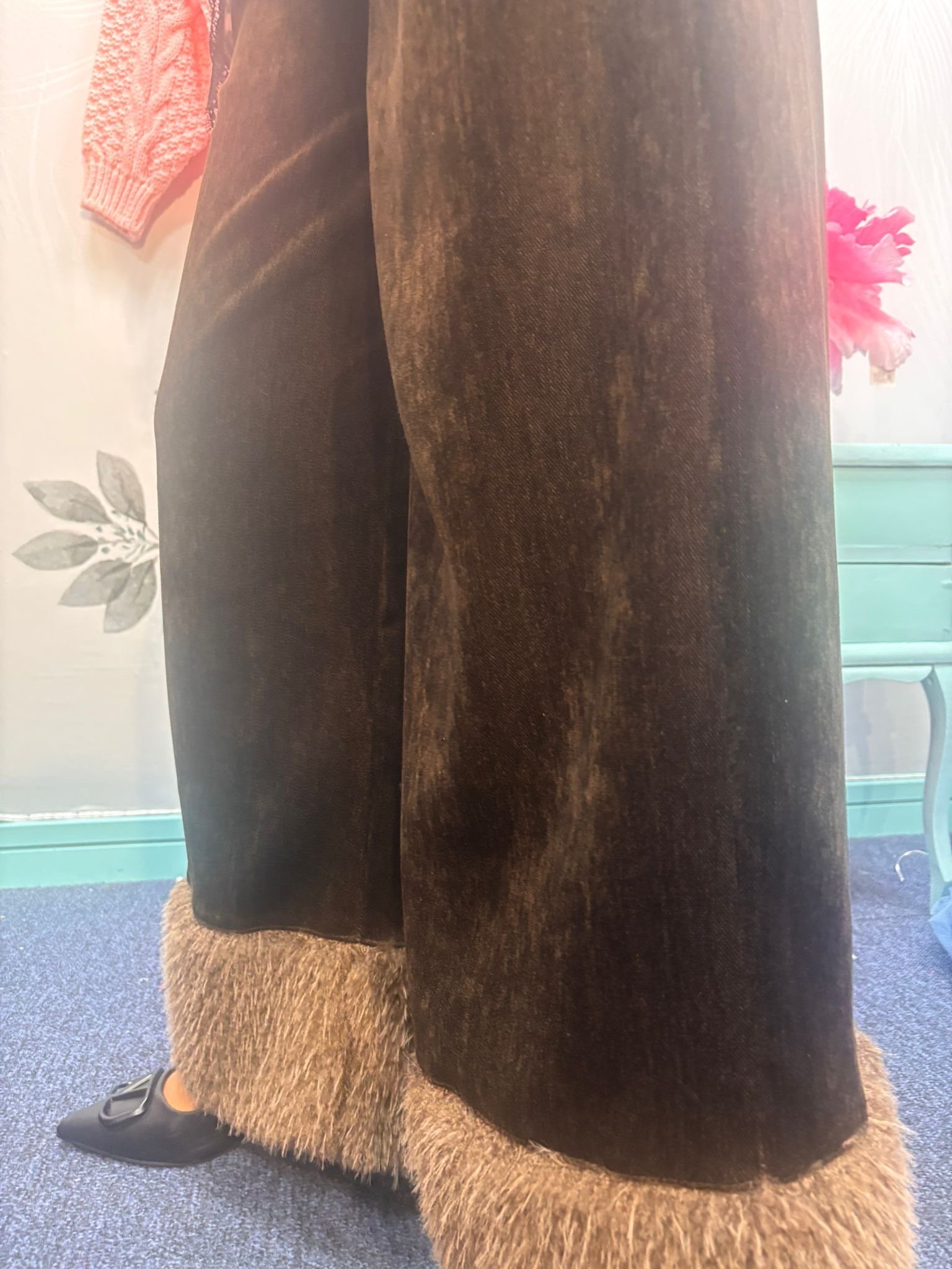 Luce sofisticada y moderna con nuestro conjunto pana lisa en marrón cjocolate combinando estilo, comodidad y elegancia.La chaqueta destaca por su cuello de pelo y puños de pelo, aportando un toque cálido y chic. El pantalón se ajusta a la silueta estilizando la cintura con detalles de bolsillo en oro y cintura añaden un toque de lujo y distinción