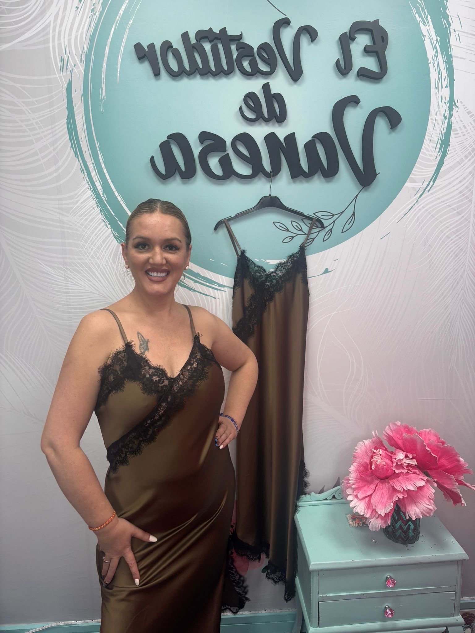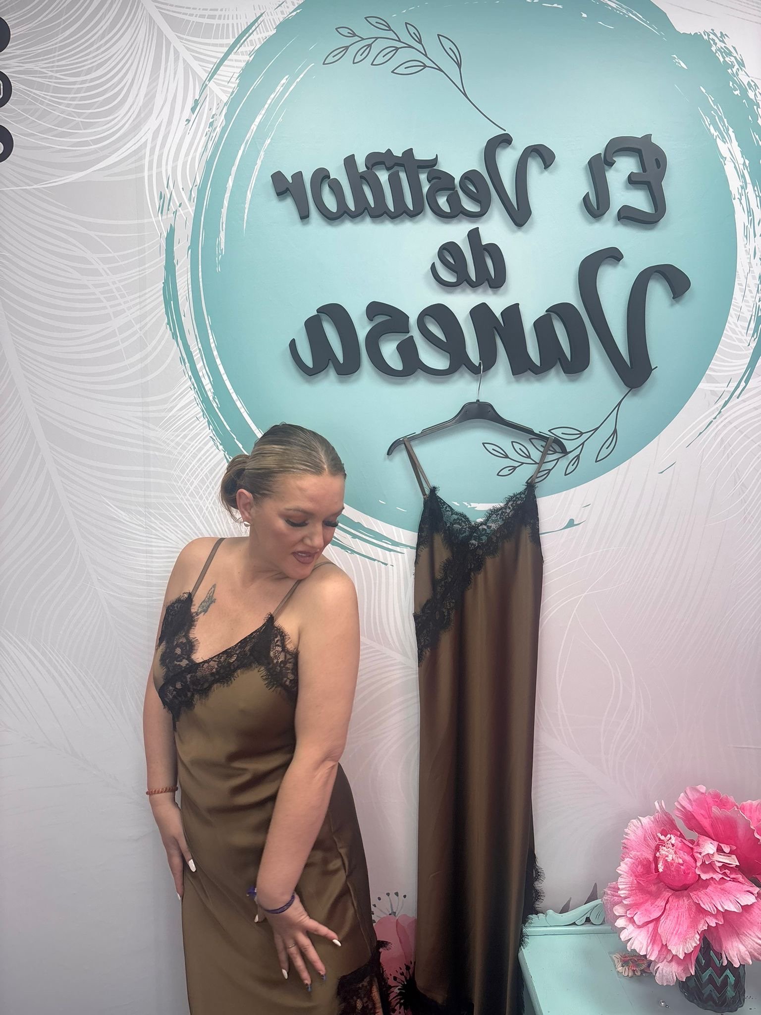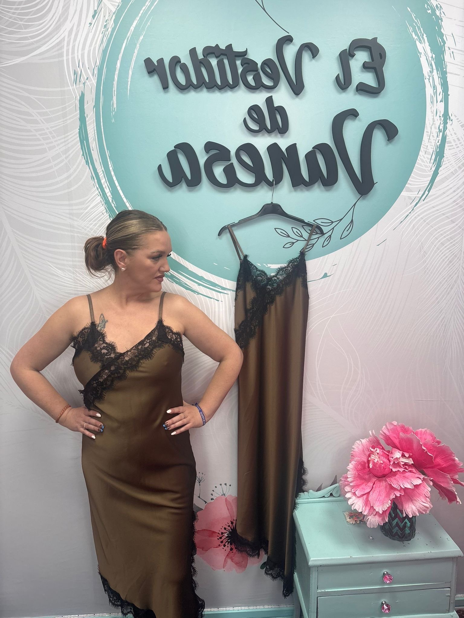 De tejido satinado con caída fluida, se adapta suavemente al cuerpo realzando la silueta sin marcar.