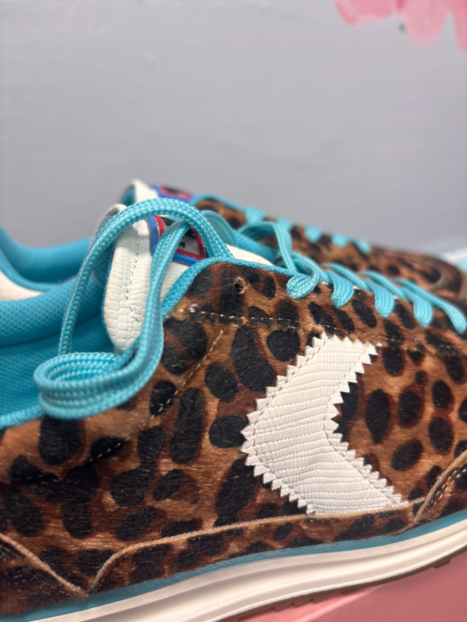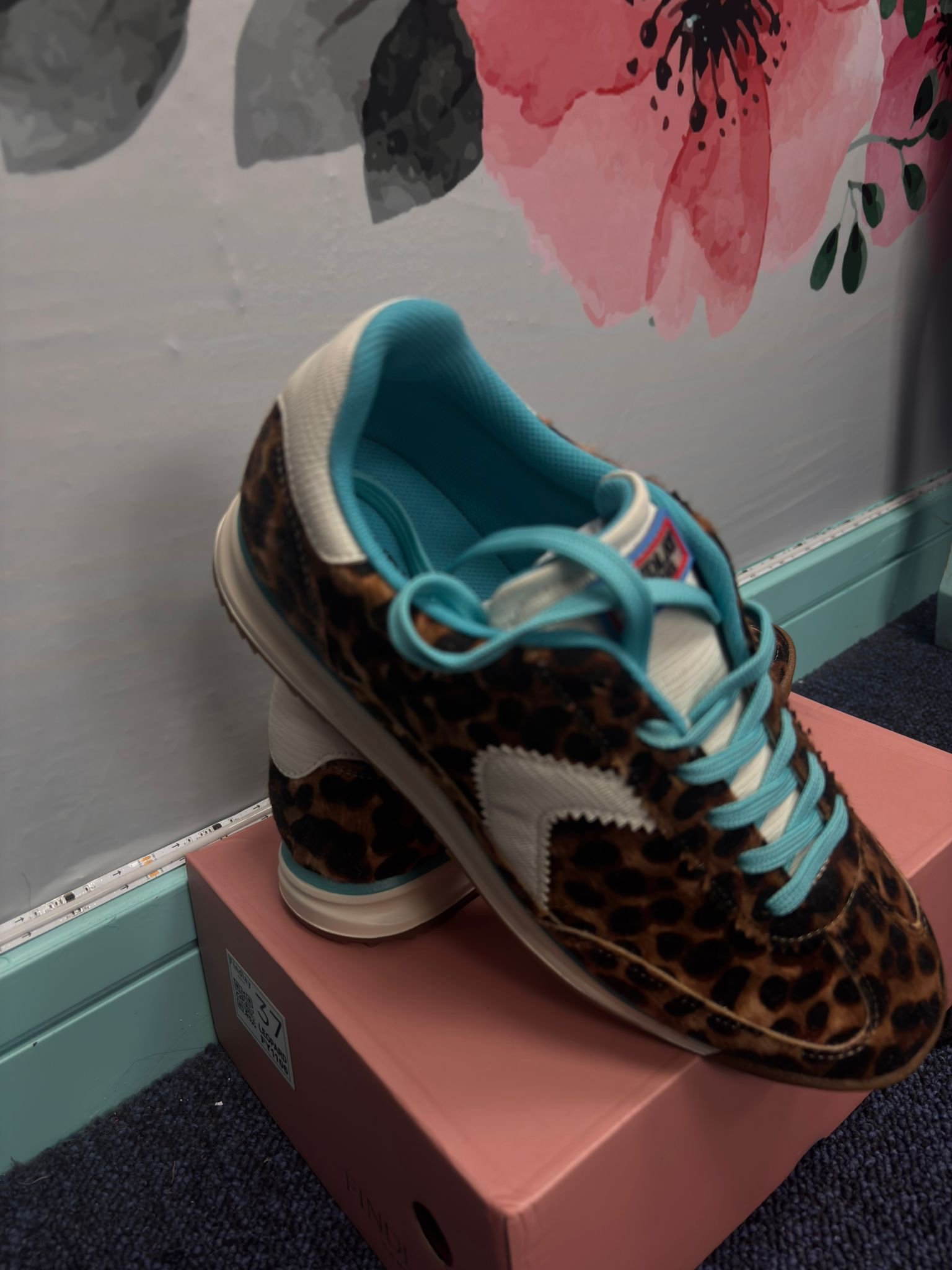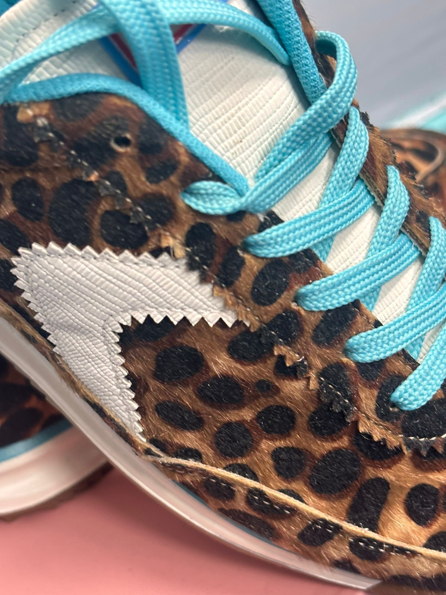 Una zapatilla deportiva con cuña interior de 3 cm ideal para combinar con tus jeans o legging, con un estampado de animal print y pelito muy sofisticado, con cordones en azul turquesa que anima mucho.